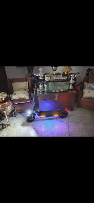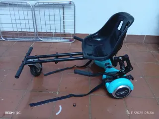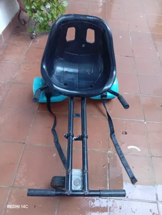 Patinete eléctrico con asiento incorporado, poco uso ,asiento con suspensión de muelles,ruedas con cámaras lector de batería etc 150€ negociables - Color azul. - Estructura metálica negra. - Ruedas delanteras y traseras.