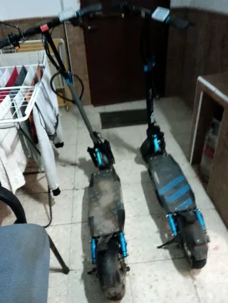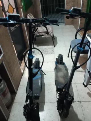 Se venden dos patinetes eléctricos. - Diseño con ruedas anchas. - Suspensiones azules. - Manillar con pantalla. Si Compras 1 te sale a 300, si compras los 2, pues a 600€