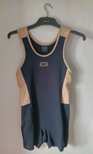 Singlete de powerlifting de la marca SBD. - Color negro y beige. - Logo SBD en el pecho.