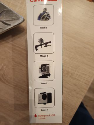 Cámara acuática perfecta para capturar tus aventuras. Puedes adaptarla a mascara acuatica , patinete, bicicleta, etc... - Sumergible hasta 30 metros. - Pantalla de 2.0 pulgadas. - Diseño compacto y ligero.