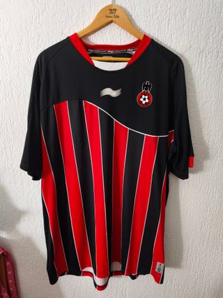 Camiseta de fútbol del OGC Nice FC. Diseño deportivo con detalles llamativos. - Color principal negro con franjas verticales rojas. - Escudo del club en el pecho. - Logo de la marca deportiva. talla 3xl