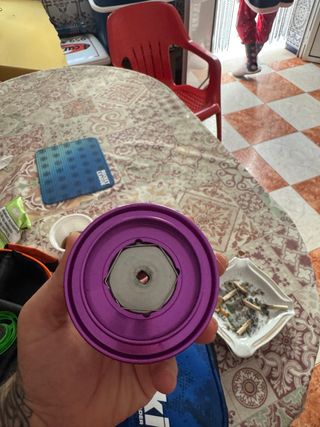 Bobina de pesca Duraflot de color morado. No esta usada pero esta bollada , no afecta al funcionamiento, no negociable ya que el precio que tiene es por el golpe que tiene