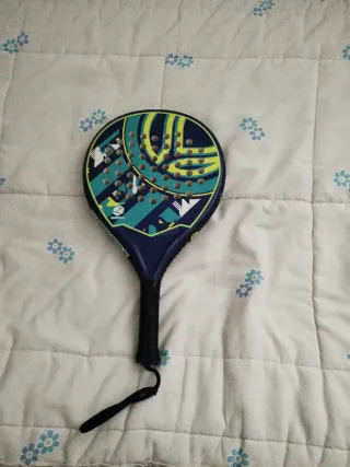 Palas de pádel con diseño moderno y llamativo. - Superficie con agujeros. - Mango con agarre negro. - Correa de seguridad negra.