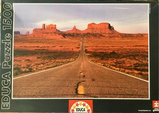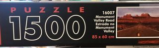 Puzzle de 1500 piezas con una impresionante imagen de Monument Valley. - Paisaje icónico de carretera y formaciones rocosas. - Ideal para aficionados a los puzzles y amantes de la fotografía de paisajes.