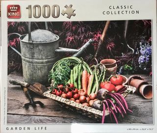 Puzzle de 1000 piezas de la colección Classic Collection de King. La imagen muestra Garden Life, una escena de jardín con verduras frescas y herramientas. - 1000 piezas. - Colección Classic Collection. - Imagen Garden Life de Paul Ward.