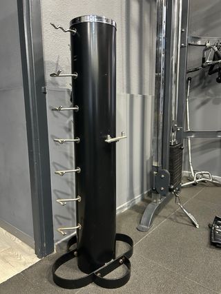 Soporte negro cilíndrico para gimnasio con ganchos. - Diseño cilíndrico. - Acabado en color negro. - Incorpora ganchos metálicos. - Base con aro metálico.