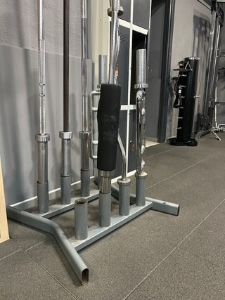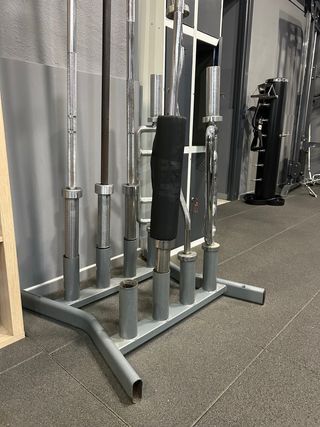 Soporte metálico para organizar barras de gimnasio. - Estructura robusta. - Diseño compacto.