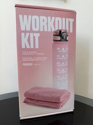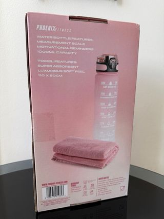 Kit de entrenamiento que incluye una botella de hidratación y una toalla. - Botella de hidratación de 1000 ml con recordatorios. - Toalla de entrenamiento de 110 x 50 cm. - Marca: Phoenix Fitness.