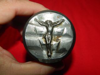 Cuño antiguo de acero en positivo con cruz y Jesus de espaldas crucificado.