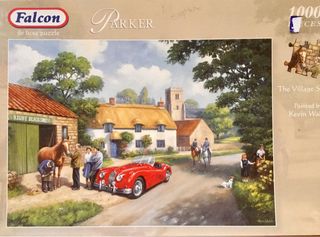 Puzzle de la marca Falcon, modelo Parker, con 1000 piezas. La imagen representa una escena rural con una casa, un coche clásico y personas. - 1000 piezas. - Marca: Falcon. - Modelo: Parker. - Ilustración: The Village Smithy de Kevin Walsh.