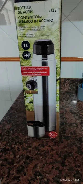 Botella térmica de acero inoxidable con capacidad de 1 litro. Mantiene la temperatura de tus bebidas. - Material: Acero inoxidable. - Capacidad: 1 L. - Diseño moderno y funcional.