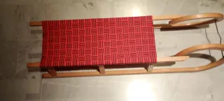 Trineo clásico de madera con un asiento acolchado de tela roja. - Estructura de madera robusta. - Asiento con diseño a cuadros en rojo y negro.