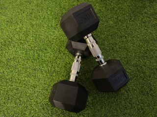Par de mancuernas hexagonales de caucho, cada una con un peso de 10kg. Ideales para entrenamientos. - Peso: 10kg por mancuerna. - Material: Caucho y metal. - Diseño: Hexagonal para evitar que rueden.