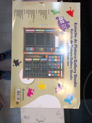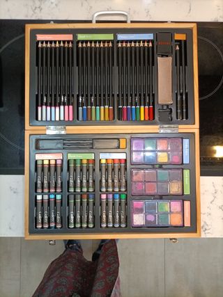 Estuche de arte con una gran variedad de materiales para dibujar y pintar. Solo se han usado las acuarelas y los pinceles. El resto está nuevo. - Lápices de colores en tonos pastel, tierra y primarios. - Pasteles de tiza. - Acuarelas. - Lápiz y goma de borrar.