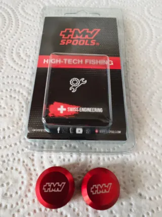 Dos tapones para carrete Shimano de color rojo de la marca MVspools, precio no negociable, pareja 20€, unidad 12€.