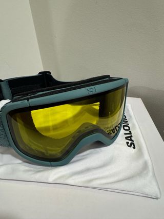 Gafas de esquí Salomon para niño, con lente de color amarillo. - Montura de color azul verdoso. - Correa ajustable.