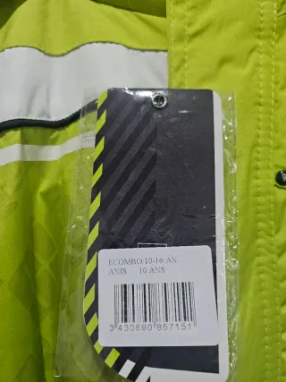 Mono de esquí para niño, talla 10 años. Ideal para disfrutar de la nieve con comodidad y protección. - Color verde lima con detalles blancos y negros. - Cintura elástica para un mejor ajuste. - Capucha integrada y extraíble. - Nuevo sin estrenar con etiquetas.