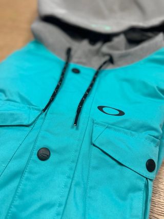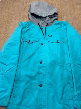 Chaqueta de esquí o snowboard de la marca Oakley talla S. Diseño moderno y funcional. - Color azul turquesa y gris. - Capucha ajustable con cordones. - Bolsillos frontales con solapa y botón. - Cierre de cremallera con botones. - Logo de Oakley en el pecho.