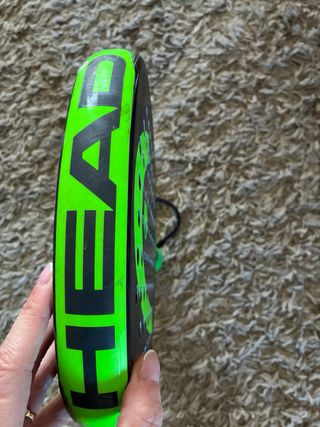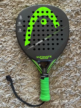 Pala de pádel Kuikma Ultimate Power con un diseño llamativo en negro y verde. - Pala de pádel. - Modelo Ultimate Power. - Color principal negro con detalles en verde. - Incluye protector integrado. - Empuñadura verde. - Correa de seguridad negra. Núcleo EVA Comfort Foam y sistema IPS protector en el marco. En buen estado, con roces normales de uso en el marco (ver fotos). Sin grietas ni roturas.