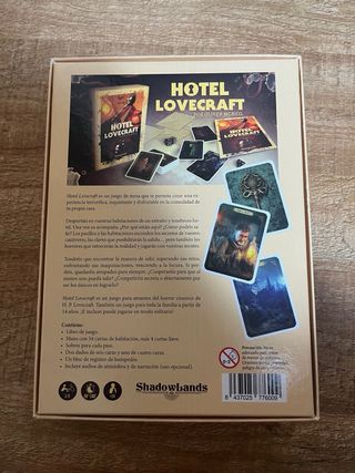 Juego de mesa temático de Hotel Lovecraft. Hotel Lovecraft es un juego de cartas lleno de intrigas, engaños, cooperación y puñaladas por la espalda. Despertáis en las habitaciones de un tenebroso hotel. ¿Por qué estáis aquí? ¿Cómo podéis salir? Los pasillos y habitaciones esconden el secreto de vuestro cautiverio, y la posibilidad de escapar… pero también los horrores que retorcerán la realidad y jugarán con vuestras mentes. Con una partida y enfundado De 1 a 5 jugadores 120min A partir de 14 años