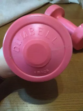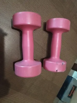 Par de mancuernas de 1.5 kg cada una, perfectas para entrenamientos en casa. - Color rosa. - Diseño ergonómico para un agarre cómodo. - Ideales para ejercicios de fuerza y tonificación. Una de ellas está mordida por un perro como se ve en la foto