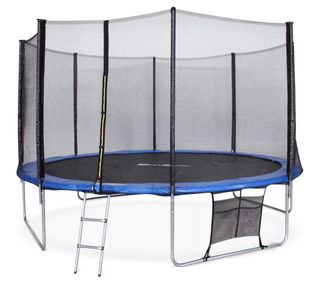 Trampolín de gran tamaño para disfrutar al aire libre. Ideal para jardines y espacios amplios.Aguanta hasta 150 kg (estructura reforzada). Inluye: escalera + funda protectora + bolsilla para zapatos - Diámetro de 430 cm. - Incluye red de seguridad. - Escalera de acceso. - Malla de almacenamiento.