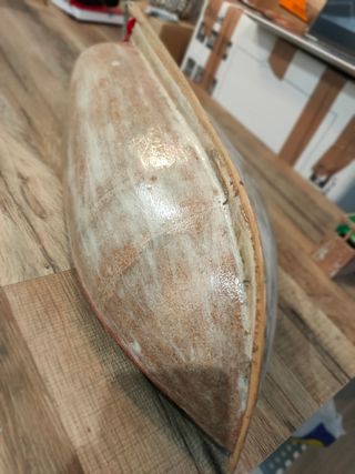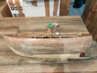Casco de barco a motor hecho a mano en corcho encolado y barnizado ( eslora 53 cm, manga 20 cm). Listo para pintar y poner servos. 30 €
