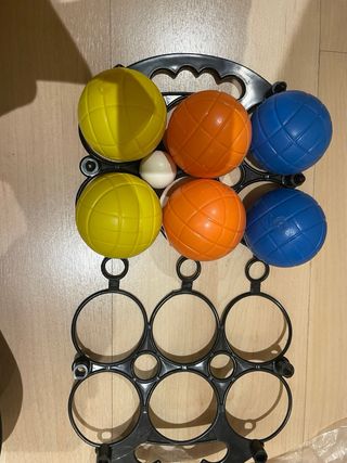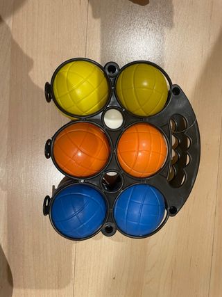 Set de petanca con bolas de colores y un boliche. - Seis bolas de petanca: dos amarillas, dos naranjas y dos azules. - Un boliche blanco.