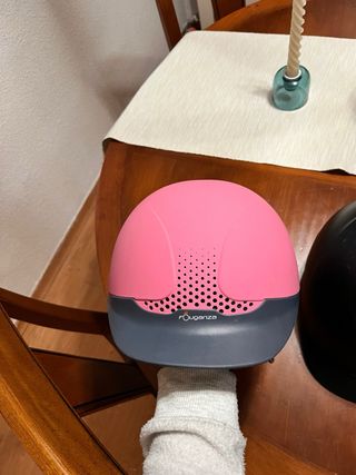 Lote de tres cascos de equitación para niños de Decathlon. - Casco rosa usado previamente. - Casco negro usado previamente. - Casco marrón chocolate nunca ha sido usado, está como nuevo y con etiquetas. Talla M (55-57cm) en los tres cascos. Cuenta con un diseño con múltiples orificios que facilitan la ventilación, con un cierre de seguridad y visera integrada. POR SEPARADO 10€, EL LOTE DE 3 25€.