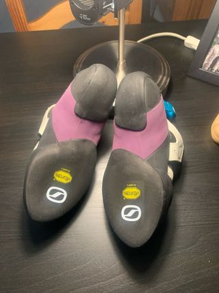 Pies de gato Scarpa Instinct VSR LV en talla 38. Diseñados para escalada. - Cierre de velcro. - Color morado, blanco y negro. - Suela de goma.