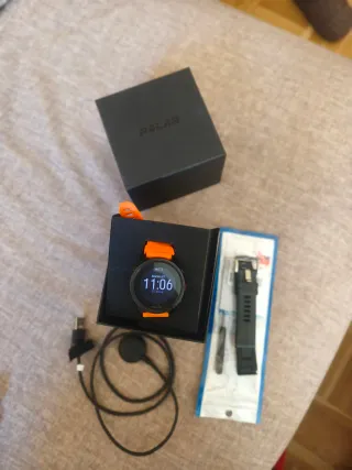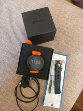 Pulsómetro GPS Polar Grit X en color negro y naranja. - Incluye caja original. - Incluye cable de carga. - Incluye correa de repuesto negra. - Incluye herramienta para cambio de correa. Tengo varios pulsómetros más,,así que tiene poco uso.En muy buen estado.