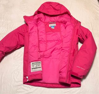 Conjunto de esquí Columbia que incluye anorak y pantalón. - Anorak rosa con capucha. - Pantalón azul marino. - Talla 10/12