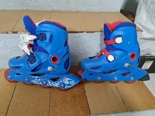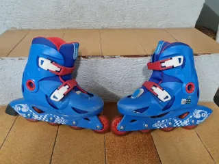 Patines en línea de color azul y rojo, ideales para iniciarse en el patinaje. - Talla: 32-34 - Cierre con velcro y hebillas - Ruedas de 60 mm