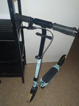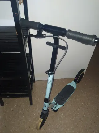 Patinete plegable de color gris, ideal para desplazamientos urbanos, y paseos. - Manillar ajustable en altura. - Ruedas de goma. - Plataforma antideslizante. Se ha usado muy poco. Lo único que tiene es a goma de una maneta algo desplazada. Pero no dificulta la marcha.