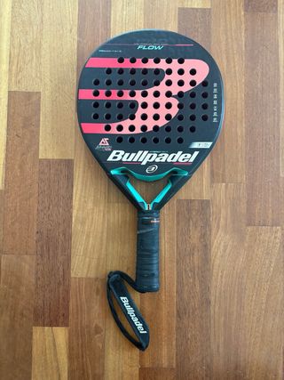 Pala de pádel Bullpadel Flow con diseño moderno. - Pala de pádel Bullpadel. - Modelo Flow. - Diseño en negro y rosa con detalles en verde. - Incluye correa de muñeca.