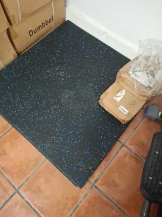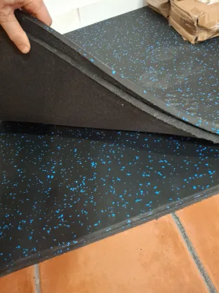 Suelo técnico de alta calidad con un diseño moderno y funcional. Negro con motas azules Son losetas de 1 metro x un metro y 15mm. De grosor 25 € METRO CUADRADO MAS MATERIAL EN MI PERFIL - Material: Caucho. - Color base: Negro. - Detalle: Gránulos de color azul. - Grosor: [Especificar grosor si se conoce] - Uso: Ideal para gimnasios, áreas de entrenamiento o zonas de alto tránsito.