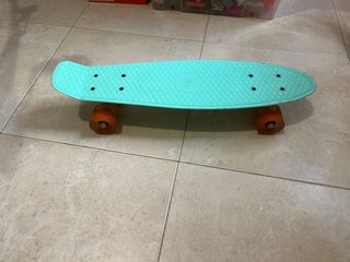 Monopatín de color menta con ruedas naranjas. - Tabla con textura antideslizante. - Ruedas de poliuretano. - Ruedas con luces