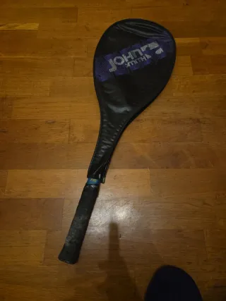Raqueta de squash o frontenis con funda. - Diseño en color negro con detalles morados y plateados. - Marca: John Smith.