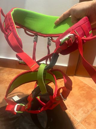 Arnés de escalada con acolchado interior en color verde brillante y exterior en rojo. - Hebillas de ajuste. - Puntos de anclaje. - Diseño ergonómico.