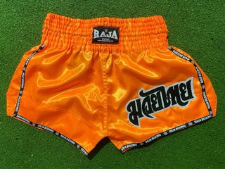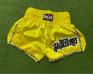 Pantalón corto de Muay Thai de la marca Raja. - Amarillo y Naranja talla M,verde talla S - Cintura elástica. - Diseño con texto en tailandés y logo de la marca.