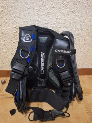 Chaleco de buceo Cressi en talla XS. Ideal para tus inmersiones. - Color negro con detalles en azul. - Talla XS. - A estrenar. Nunca usado.