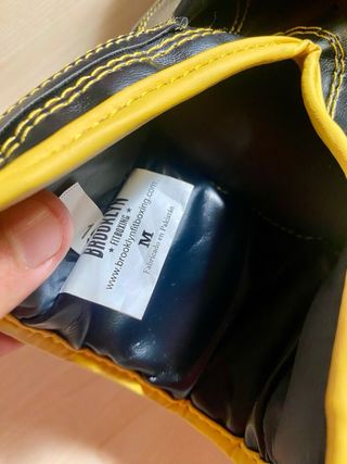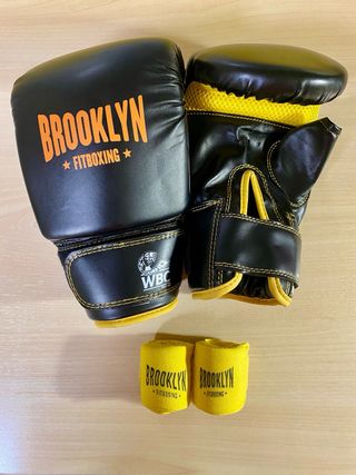 Set de guantes de boxeo Brooklyn en color negro, talla M. Incluye vendas. - Guantes de boxeo Brooklyn Fitboxing. - Color negro con detalles en amarillo. - Talla M (aunque en la bolsa ponga S) - Vendas de boxeo amarillas. - Usado una sola vez y guardado.