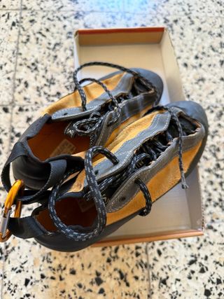 Zapatillas de escalada para pies de gato. - Cierre con cordones. - Diseño deportivo. - Color naranja y gris.
