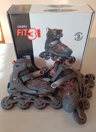 Patines en línea Oxelo Fit 3 Junior, ideales para iniciarse en el patinaje. - Color negro con detalles en rojo. - Talla EU 35/38. - Cierre con velcro y hebilla. - Ruedas de 70 mm.
