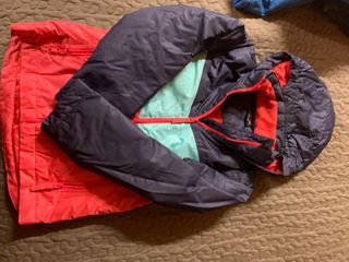 Chaqueta de esquí en color azul marino y coral, con detalles en verde menta. Ideal para actividades en la nieve. - Cierre de cremallera frontal. - Capucha integrada. - Bolsillos con cremallera.