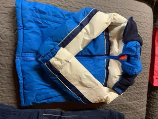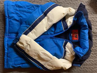 Chaqueta de esquí para niño, talla 9-10 años. Perfecta para mantenerse abrigado en la montaña. - Diseño en azul con detalles en blanco y azul marino. - Cremallera frontal. - Cuello alto.