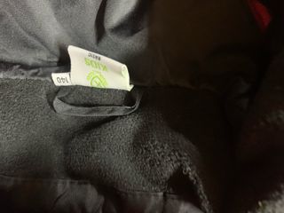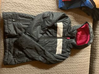 Chaqueta de esquí para niña, talla 140. Ideal para mantenerse abrigada y protegida en la nieve. - Color gris oscuro con detalles en blanco y rosa. - Capucha incorporada. - Cremallera frontal. - Bolsillos con cremallera.
