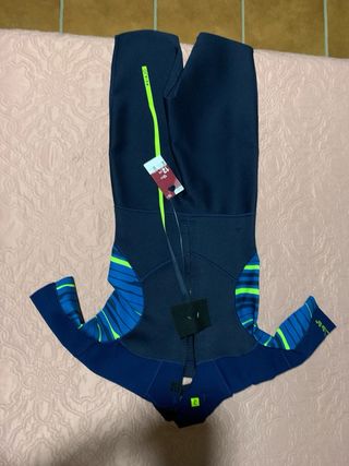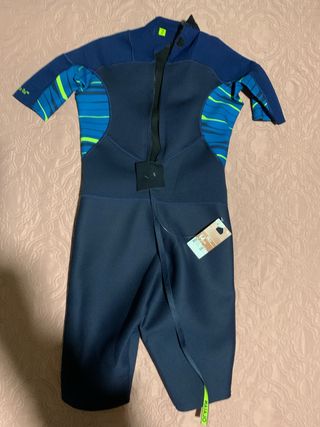 Neopreno corto de surf de la marca Olaian, talla 12. - Color azul marino con detalles en verde y azul. - Diseño de pierna corta. - Cierre de velcro en los hombros.
