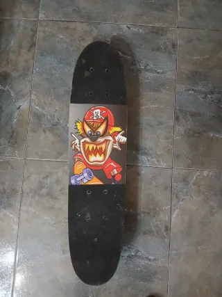 Monopatín con un divertido diseño de gato pirata en la parte central. La tabla es negra y tiene los agujeros para las ruedas. - Diseño gráfico de gato pirata. - Tabla de monopatín negra.