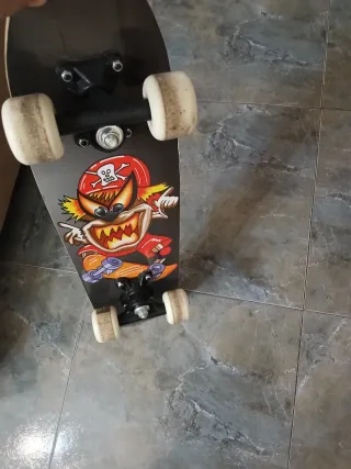 Patinete freestyle con un diseño llamativo y ruedas blancas.La tabla esta un poco gastada - Manillar negro con puños rojos. - Base con acabado iridiscente. - Ruedas blancas.